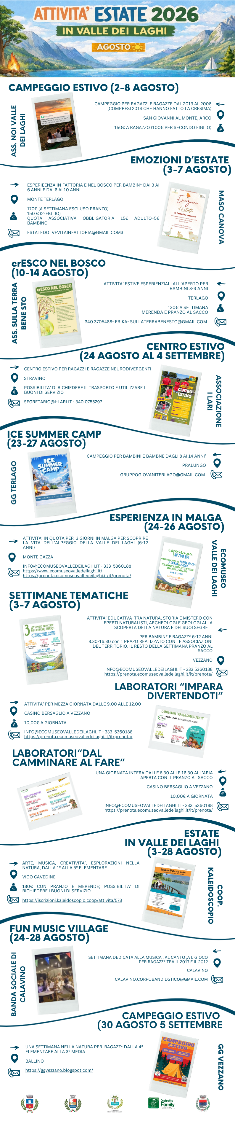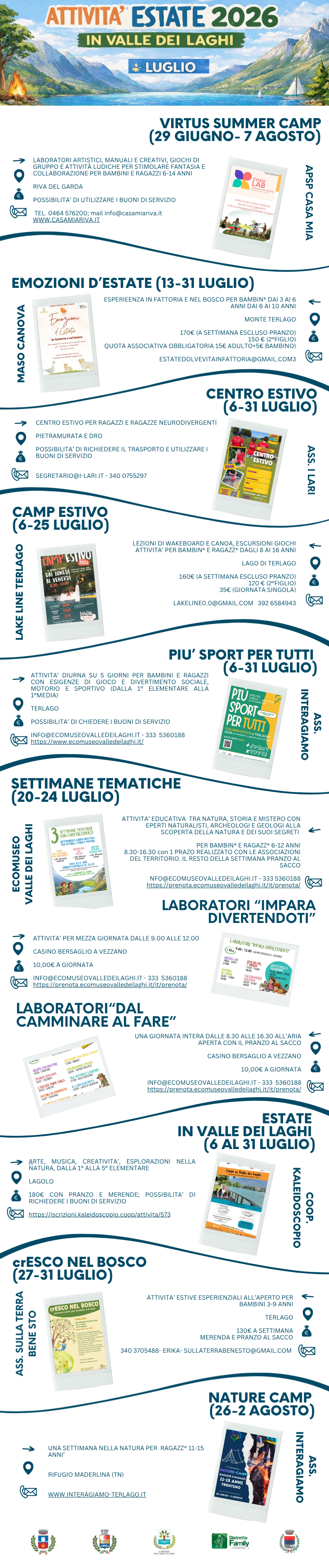 L’iniziativa di promozione unitaria è realizzata dalla rete del Distretto Famiglia Valle dei Laghi, in collaborazione con le realtà del territorio, le Amministrazioni comunali e la Comunità di Valle, per informare le famiglie delle proposte estive che saranno attivate in Valle, e supportarle nel conciliare la gestione del tempo libero dei figli/e nel periodo estivo.