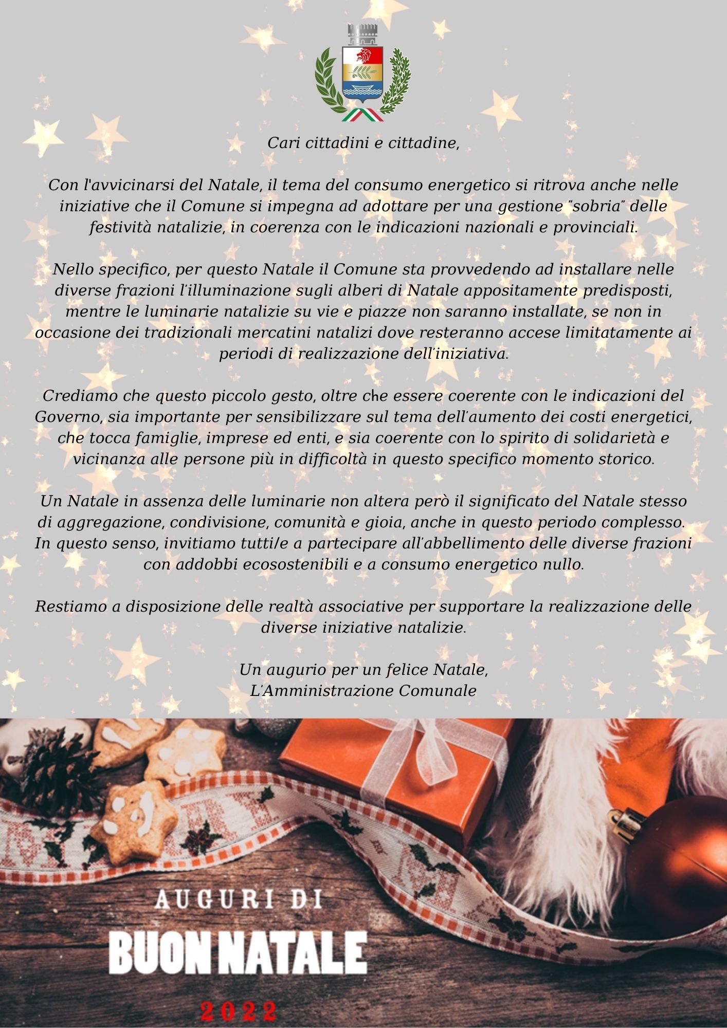 In quest'ottica per questo Natale il Comune sta provvedendo ad installare nelle diverse frazioni l’illuminazione sugli alberi di Natale appositamente predisposti, mentre le luminarie natalizie su vie e piazze non saranno installate.
