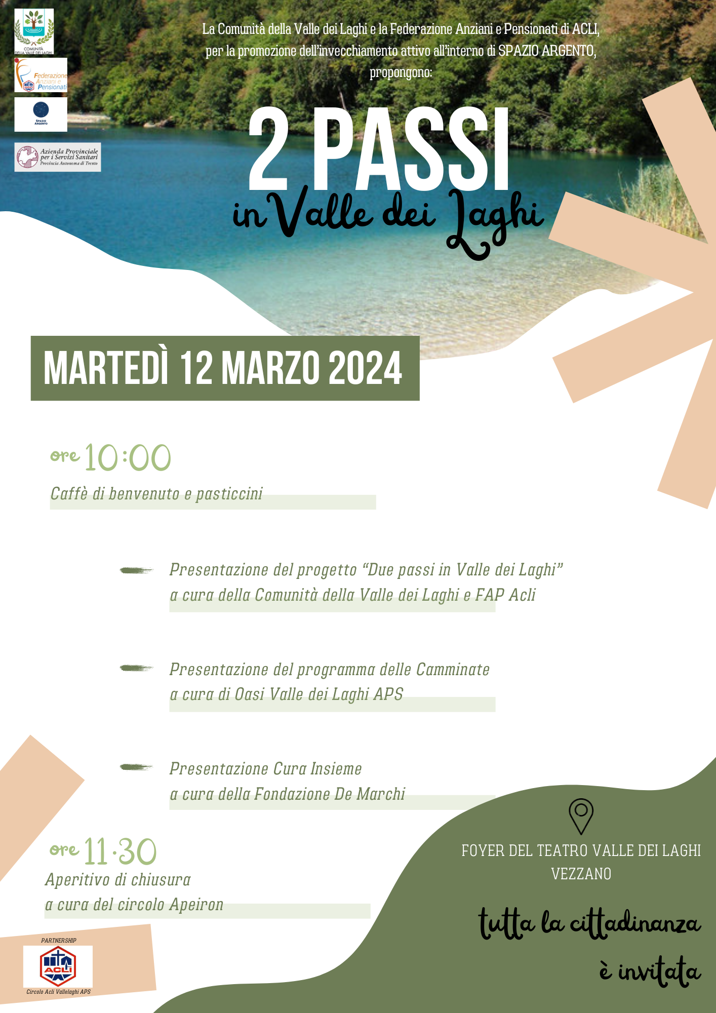 La comunità della Valle dei Laghi e la Federazione Anziani e pensionati di Acli, per la promozione dell'invecchiamento attivo all'interno di Spazio argento propongono: 2 passi in Valle dei Laghi