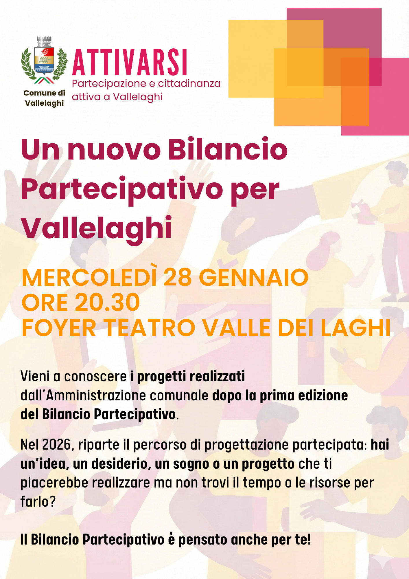 Il Comune di Vallelaghi, dopo il successo della prima edizione che si è tenuta nel corso del 2024, ha deciso di attivare nuovamente un percorso collaborativo aperto a tutta la cittadinanza per la costruzione del suo Bilancio Partecipativo comunale.