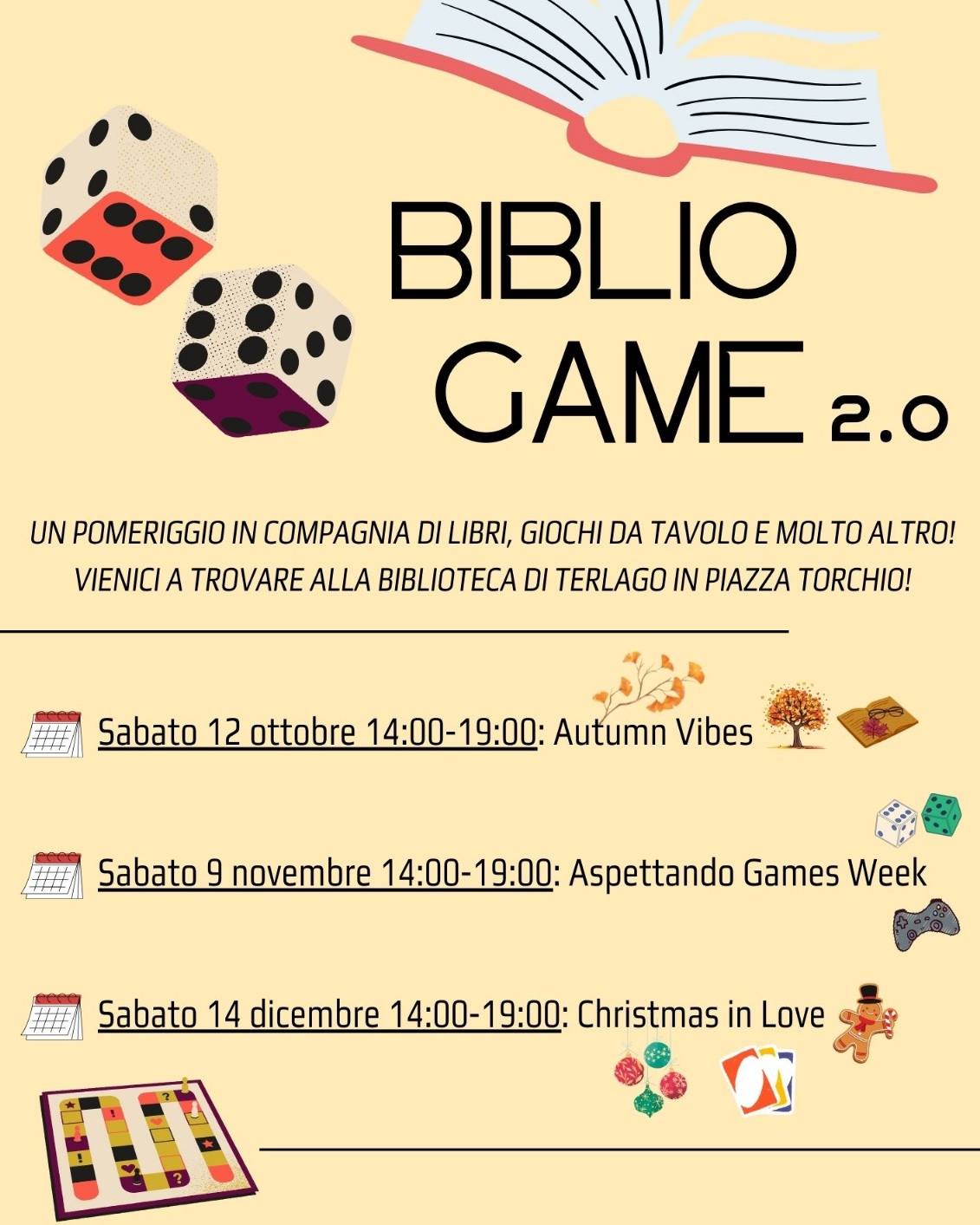 Sabato 12 ottobre la Biblioteca di Terlago sarà aperta dalle 14.00 alle 19.00 (e resterà chiusa al mattino) per la prima giornata di Biblio Game 2.0, un pomeriggio in compagnia di giochi da tavolo, libri e molto altro in collaborazione con Gruppo Giovani Terlago e Volkan - Terra dei Goblin Trento, con il titolo "Autumn Vibes".