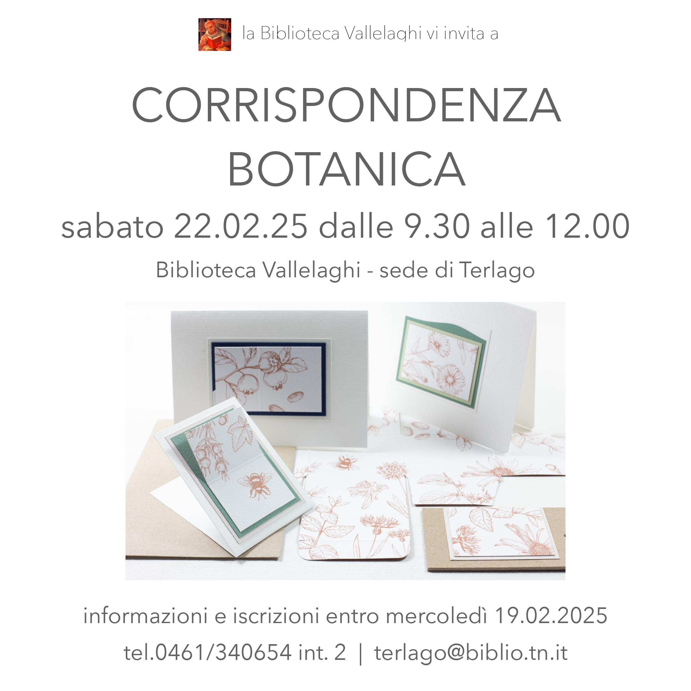 Sabato 22 febbraio dalle 9.30 presso il Punto di lettura di Terlago Lorenza Poli terrà "Corrispondenza botanica", un laboratorio creativo con l'utilizzo di carta riciclata e motivi decorativi e grafici legati al mondo vegetale.