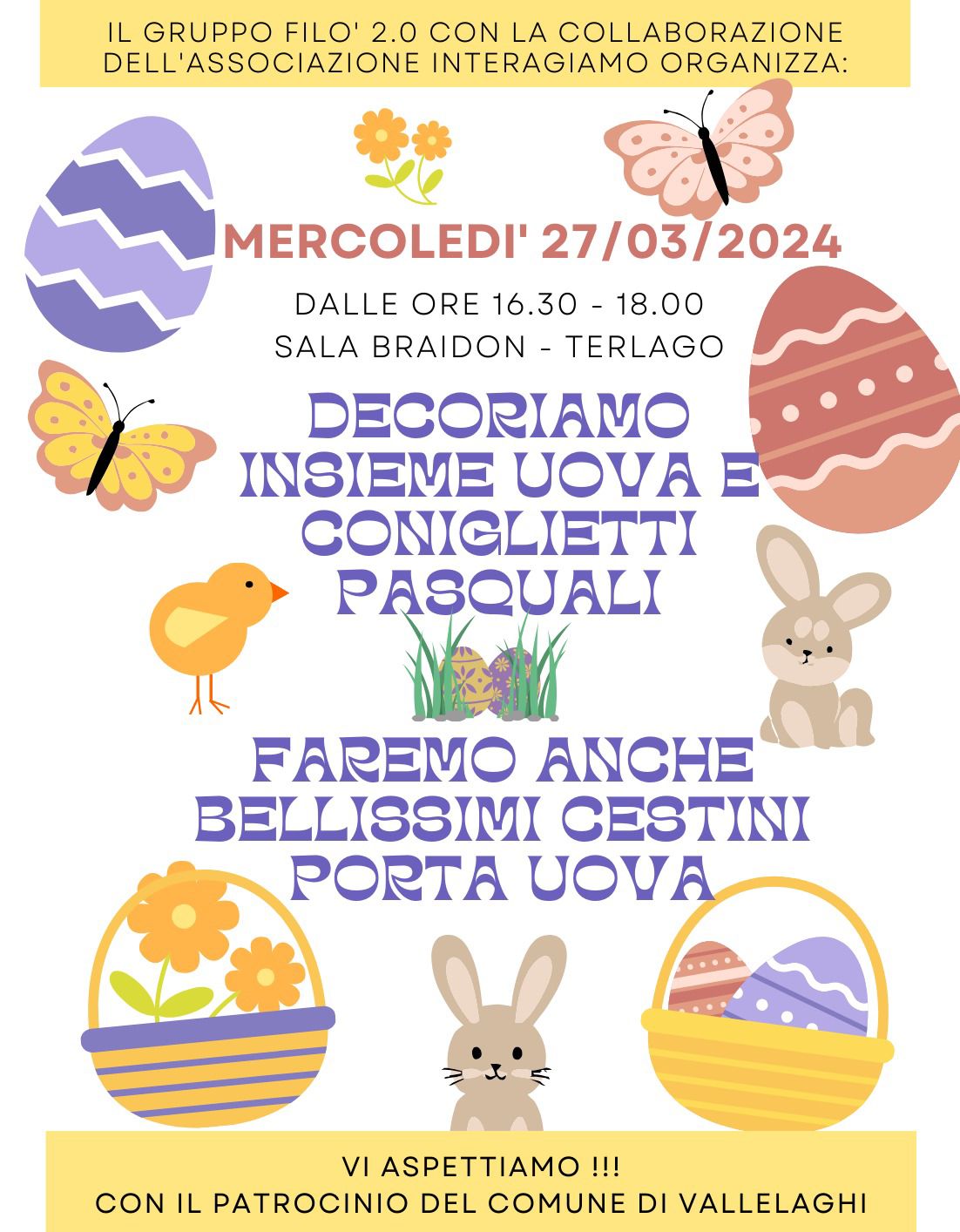 Cos'è Il gruppo filò 2.0 con l'associazione interagiamo organizza il pomeriggio di lavoretti in vista della Pasqua:decori di uova e coniglietti e creazione di cestini porta uova.