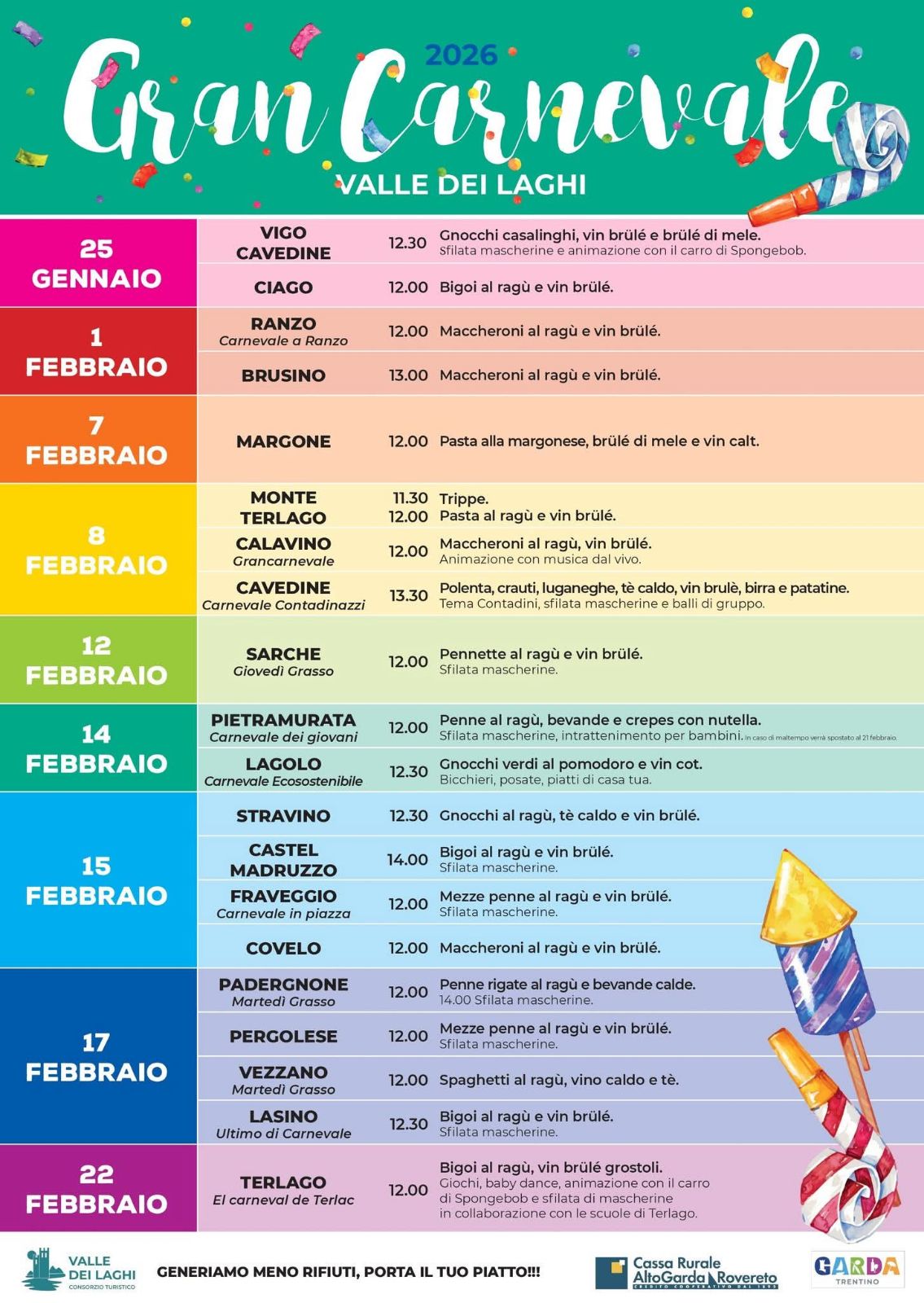 - VIGO CAVEDINE (ore 12.30): Gnocchi casalinghi, vin brûlé e brûlé di mele. Sfilata mascherine e animazione con il carro di Spongebob.