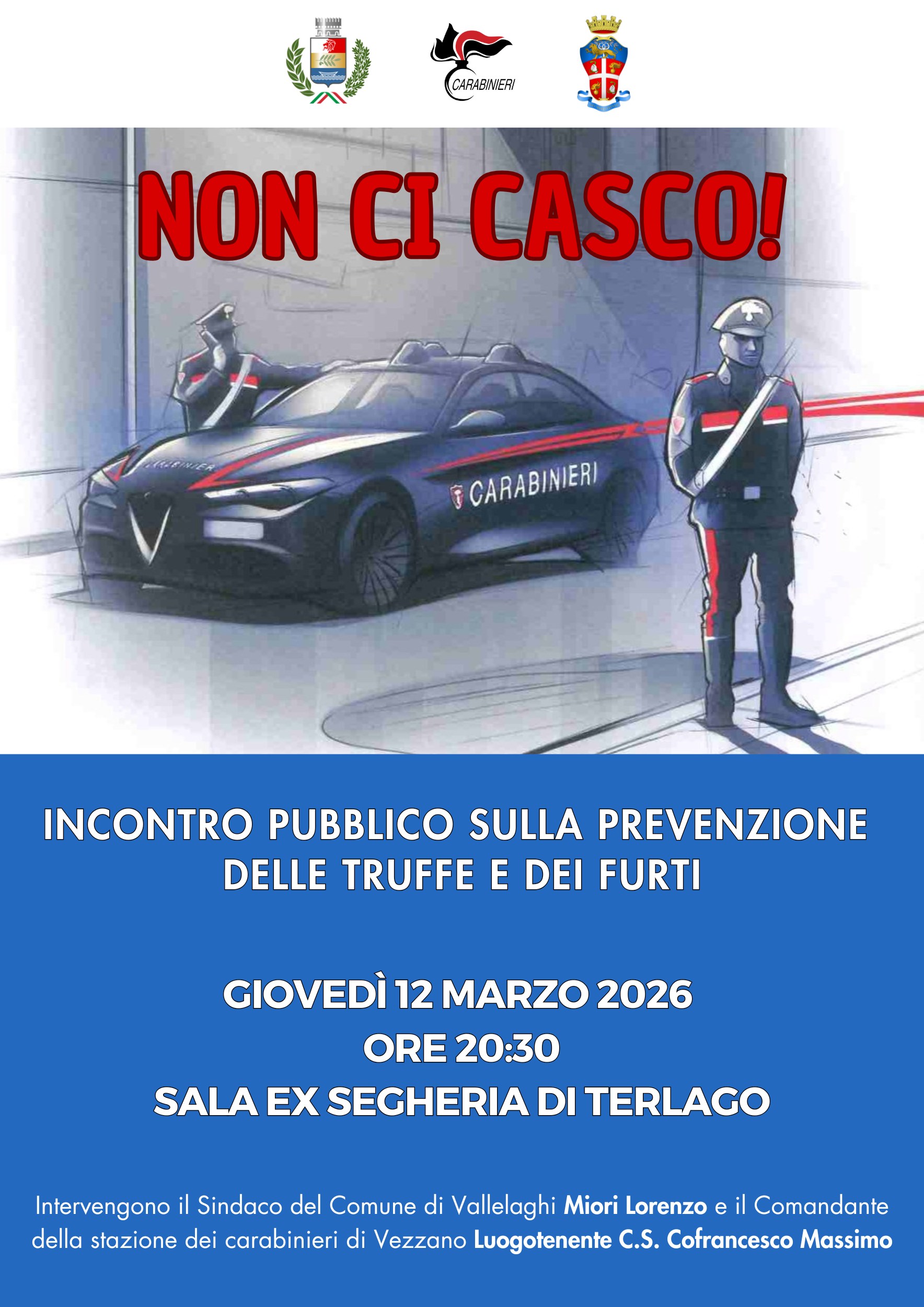 Il Comune di Vallelaghi, in collaborazione con i Carabinieri di Vezzano, organizza una serata pubblica sulla prevenzione delle truffe e dei furti.