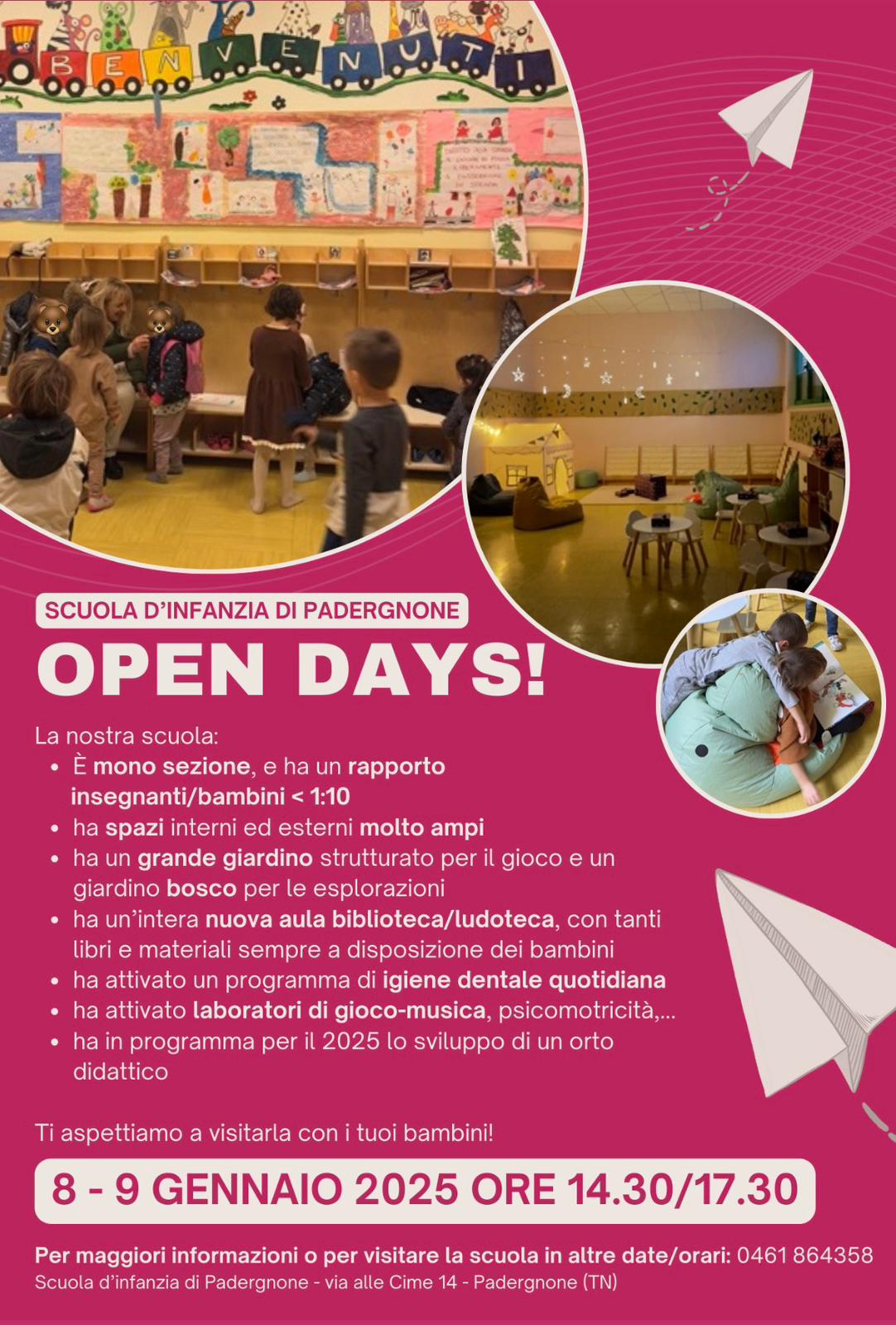 Cos'è La Scuola dell'Infanzia di Padergnone propone un open days per presentare la scuola e i suoi progetti mercoledì 8 e giovedì 9 gennaio 2025 Ore 14.30 - 17.30