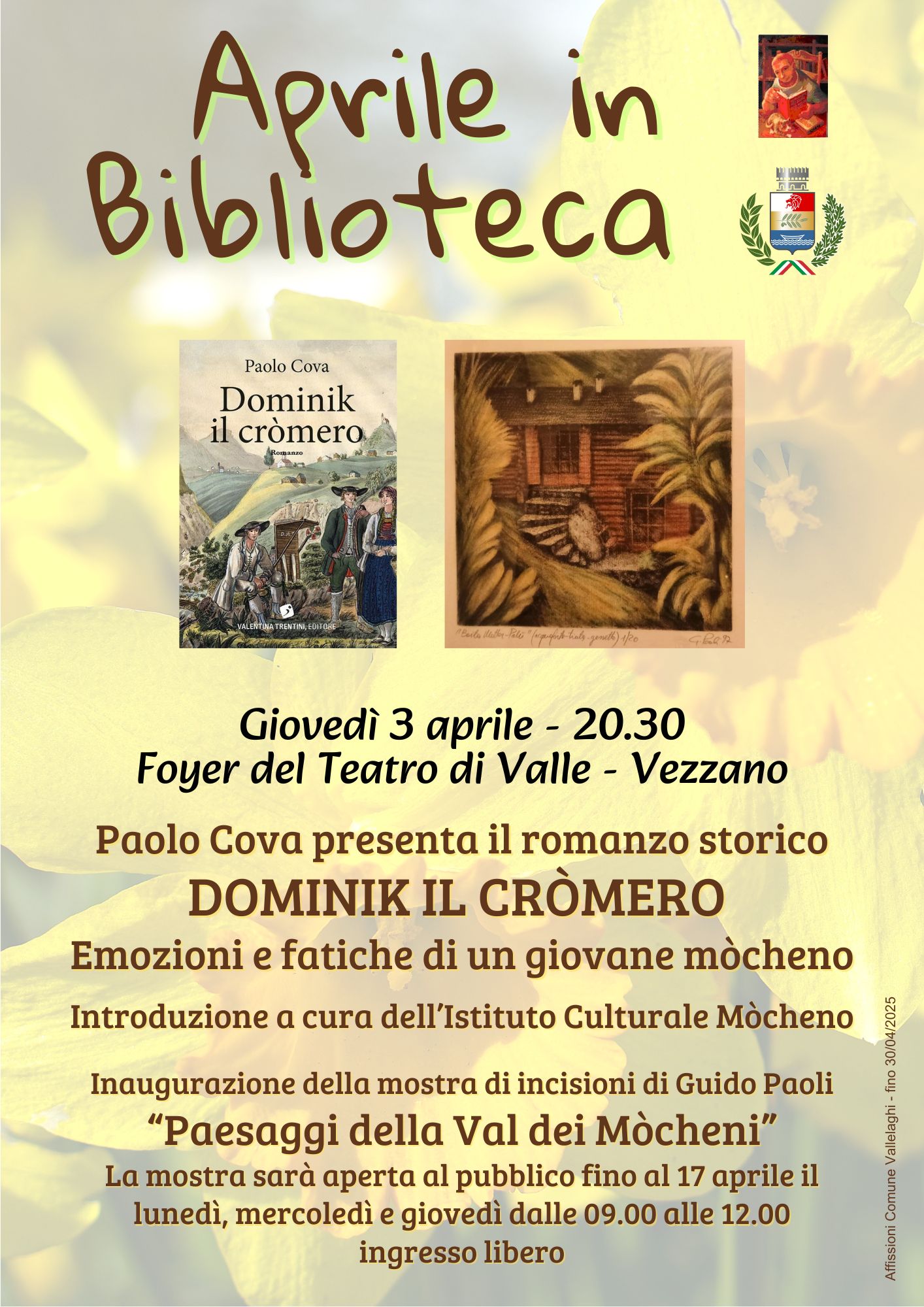 Giovedì 3 aprile alle ore 20.30 presso il Teatro Valle dei Laghi di Vezzano l'autore Paolo Cova presenterà il suo romanzo "Dominik il Cròmero", ambientato nella tradizione dei mercanti ambulanti della Val dei Mòcheni.