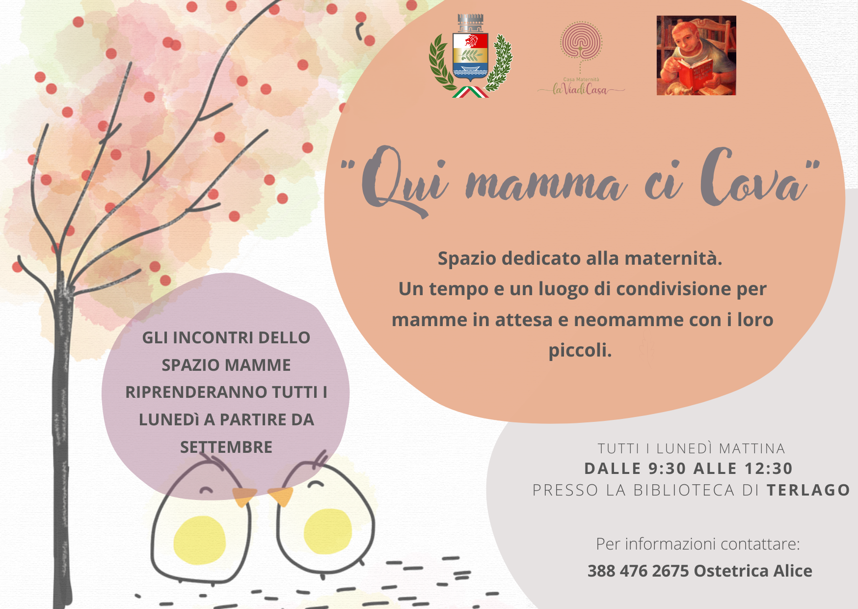 "Qui mamma ci cova", lo spazio dedicato alla maternità per mamme in attesa e neomamme con i loro piccoli, riprende a settembre tutti i lunedì mattina, dalle ore 09.30 alle ore 12.30 presso la Biblioteca di Terlago.